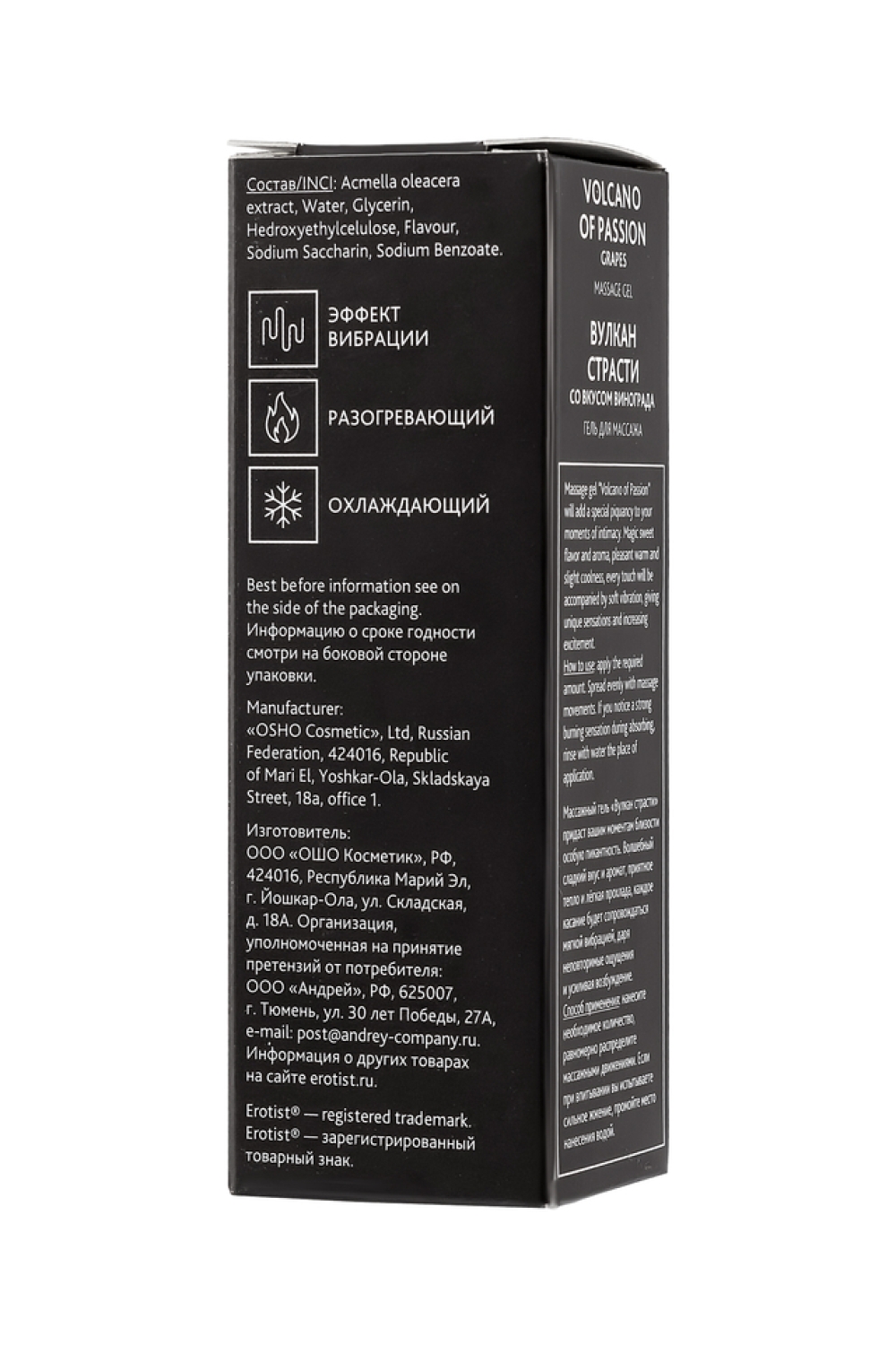 Зарегистрированным клиентам даем скидки до 20%Массажный гель «Вулкан страсти» придаст вашим моментам близости особую пикантность. Волшебный сладкий вкус и аромат, приятное тепло и лёгкая прохлада, каждое касание будет сопровождаться мягкой вибрацией, даря неповторимые ощущения и усиливая возбуждение. Нанесите немного жидкого геля на интимные зоны, и через несколько секунд вы почувствуете тепло, затем в течение 2-3 минут легкую вибрацию и легкий холодок. Длительность эффекта зависит от особенностей вашего организма. Гель с вибрирующим эффектом для интимных зон На основе натуральных ингредиентов, без парабенов Вкус и аромат винограда Подходит для поцелуев и орального секса Способ применения: нанесите небольшое количество геля на кончики пальцев и коснитесь клитора и вагинальных губ, массируя. Для наружного применения.