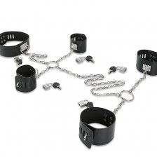 Универсальный набор представлен пятью манжетами, которые соединяются цепочками. Ошейники и две пары фиксаторов для рук и ног позволят вам зафиксировать партнера в удобном для вас положении.